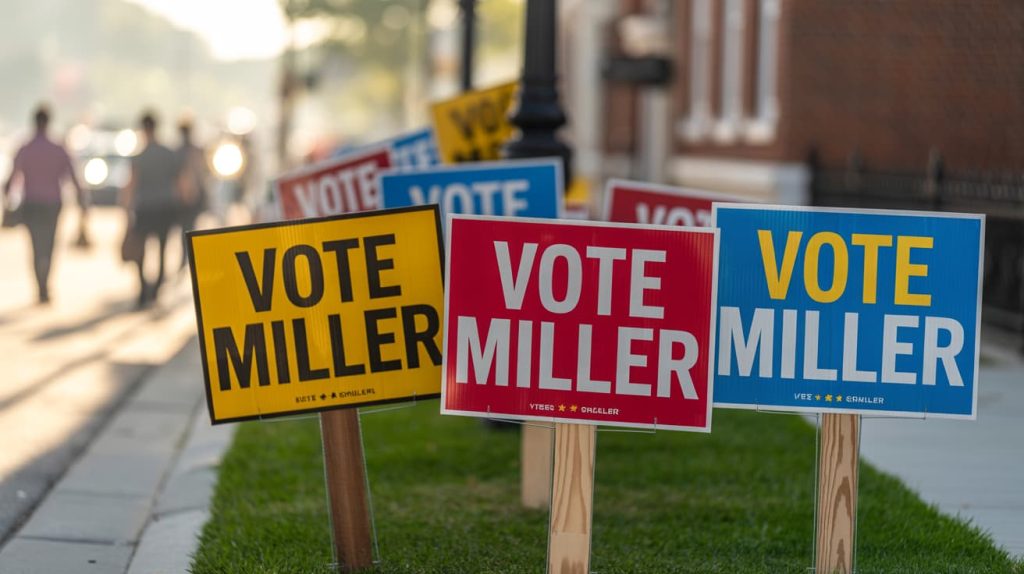 (Image Prompt: A clean yard sign with a short message, large bold letters, and high contrast colors.)